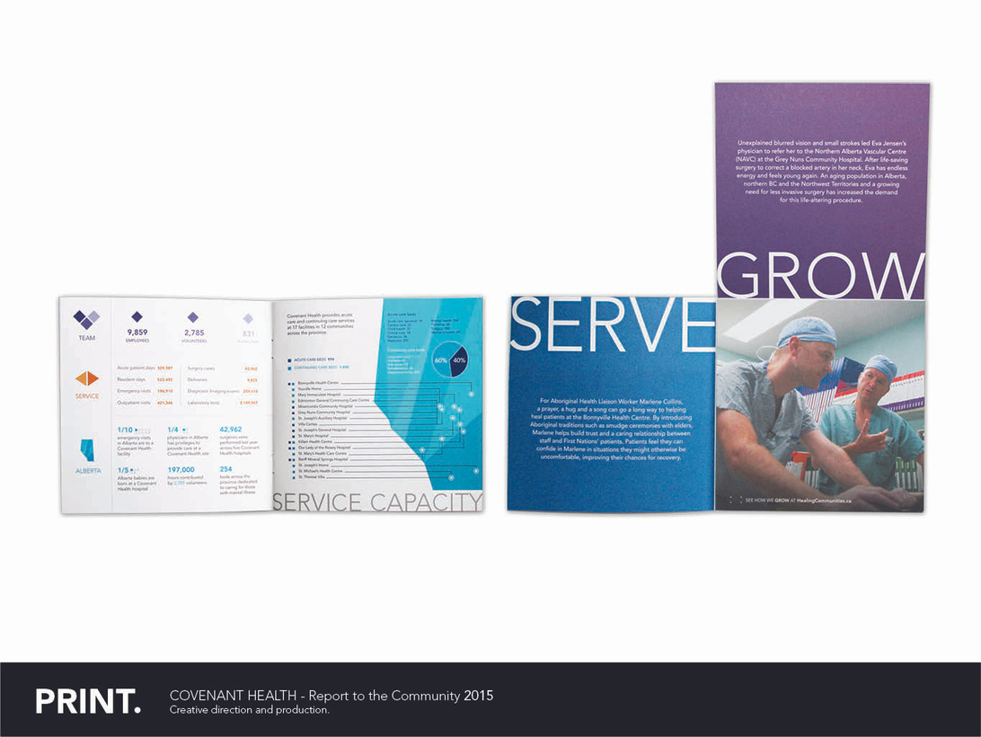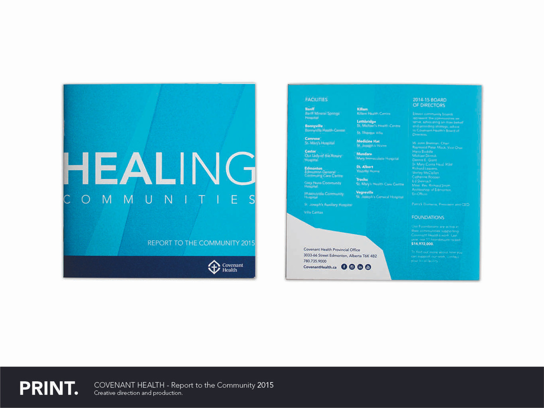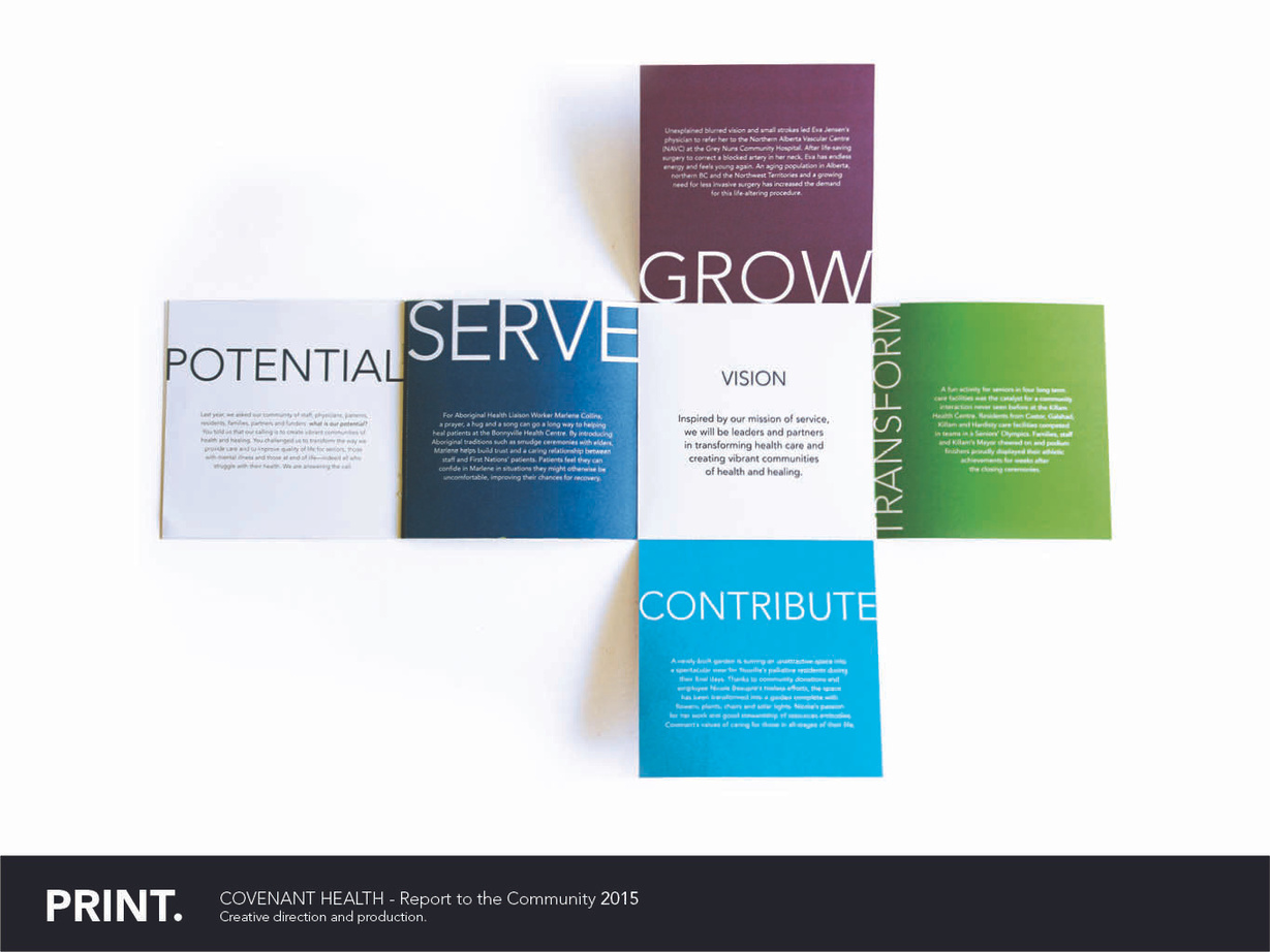 all the necessary information. The goal was to create a piece that would engage readers, and act as a keepsake for staff. The result was a small 6” x 6” piece that folds out and includes a tear-out piece highlighting the theme for the year - Covenant Health’s Strategic Direction.