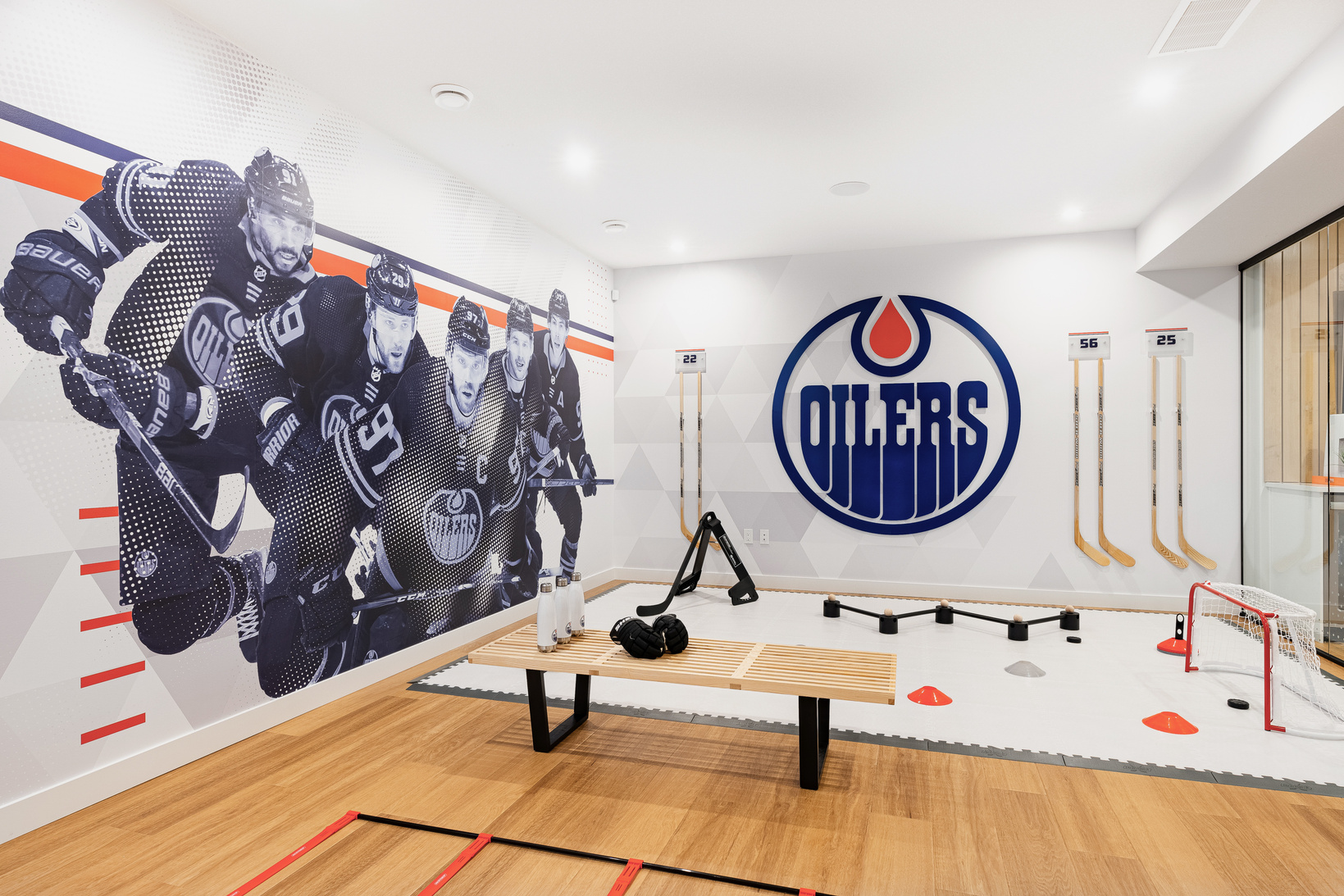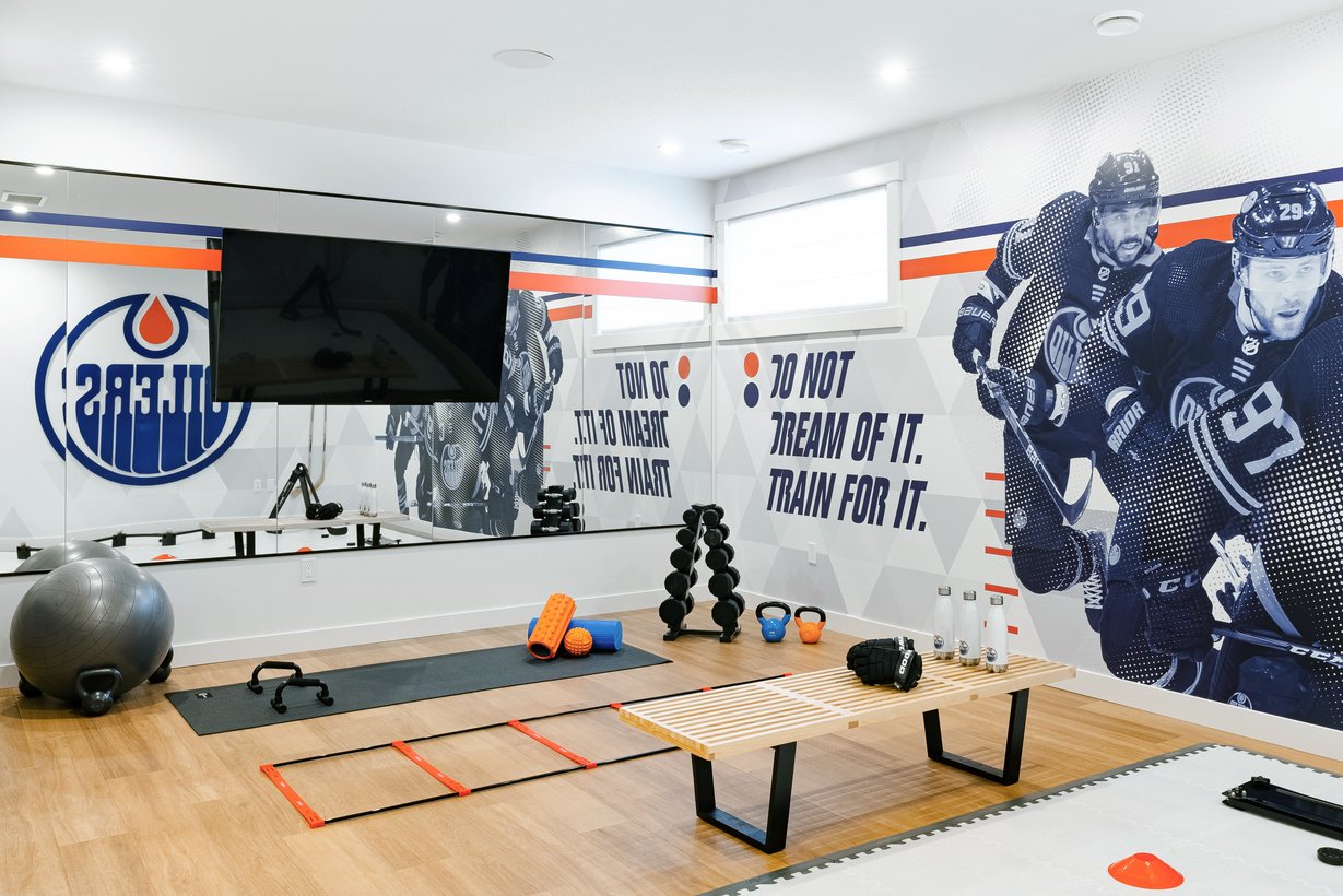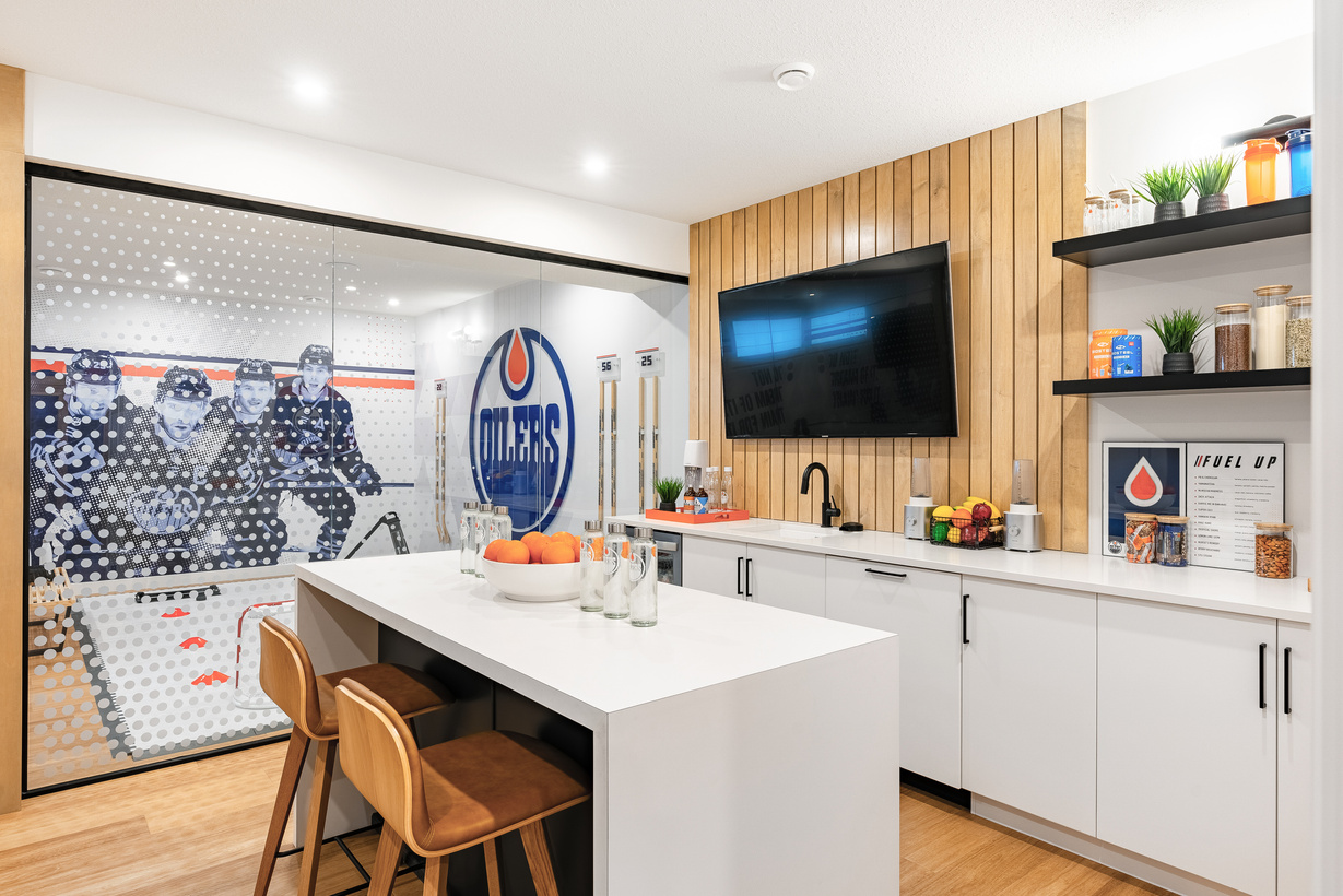 to be energetic, clean and modern. Using Coventry Homes’ signature triangles as a neutral backdrop, I created a custom mural from various images and Oilers brand elements.